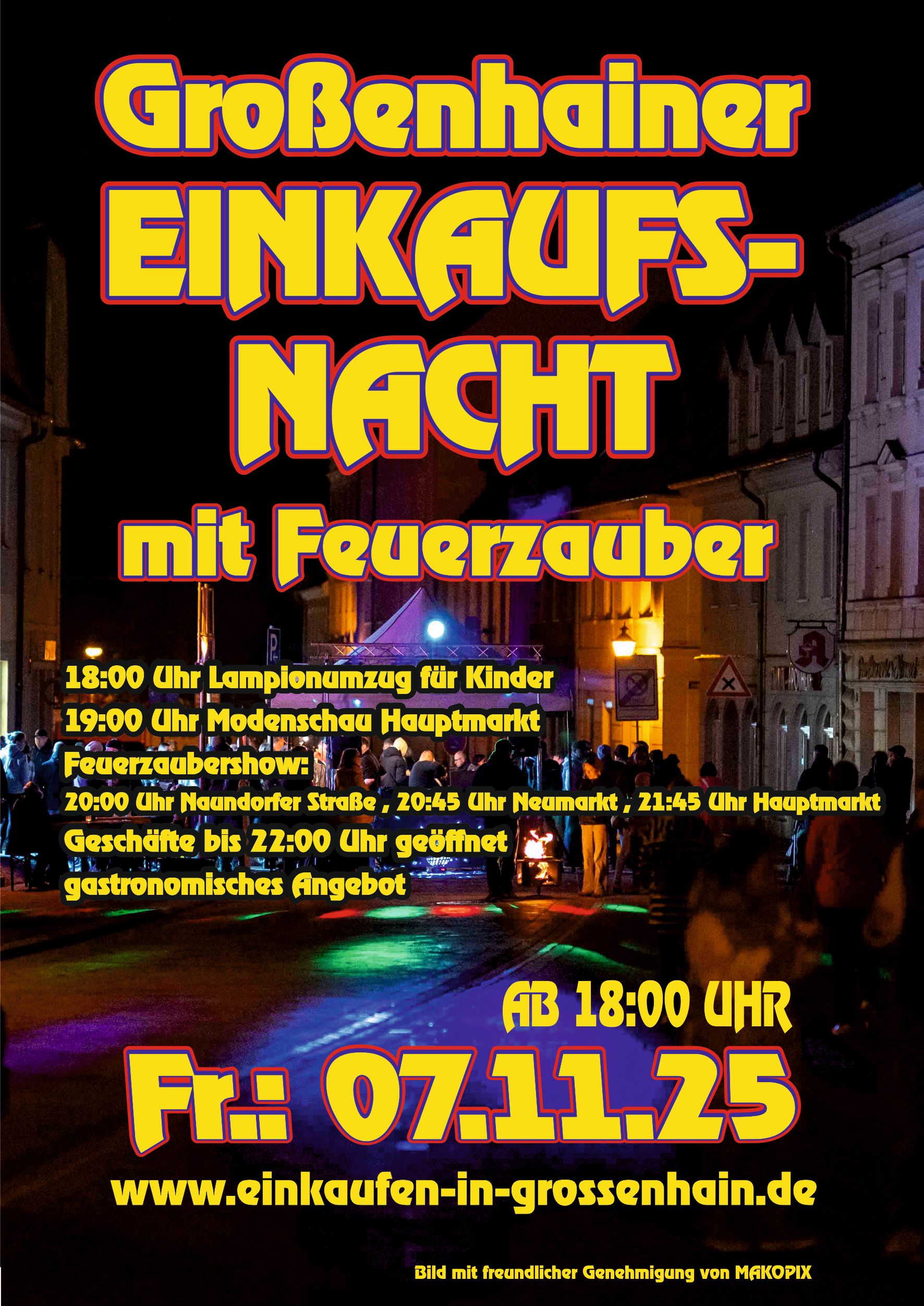 Am 7. November 2025 findet in der Großenhainer Innenstadt die beliebte Einkaufsnacht mit Feuerzauber statt.